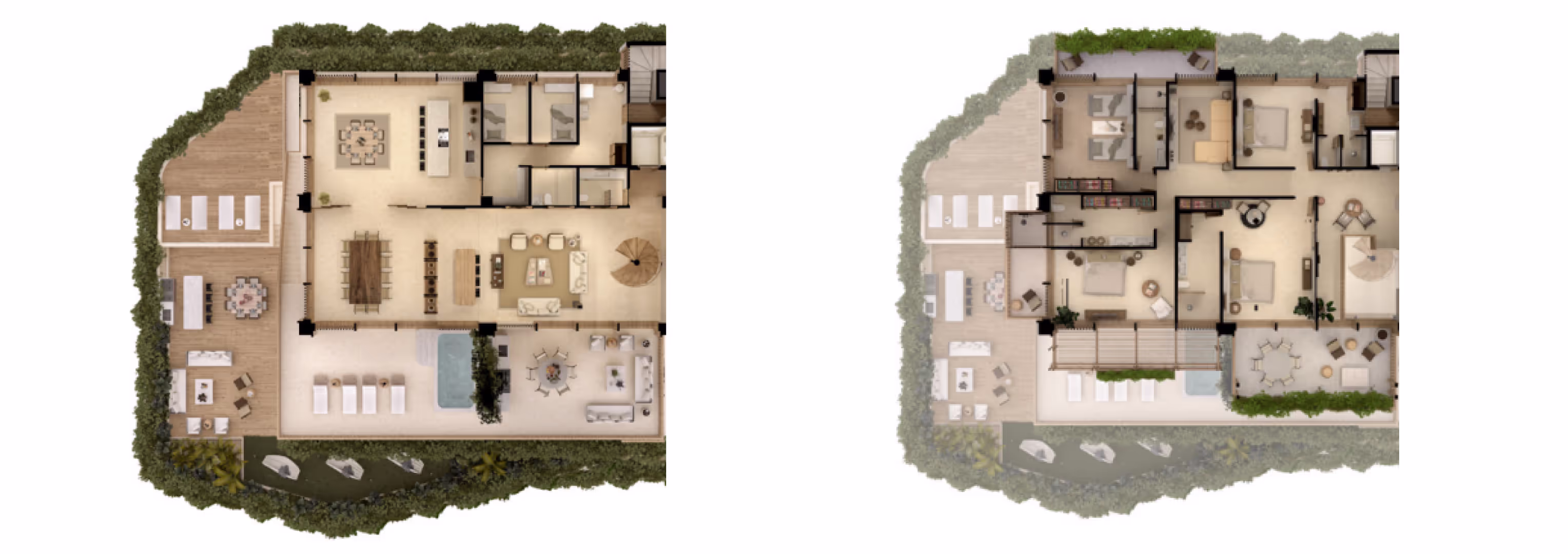Exquisitely designed for unparalleled privacy and effortless, indoor-outdoor living, the grand, two-level Penthouse occupies a full floor and provides ample space to accommodate a family plus guests. The main level is home to the chef’s kitchen, bedrooms and living areas, while the rooftop level offers a private pool, Jacuzzi, outdoor kitchen and ample space for lounging.